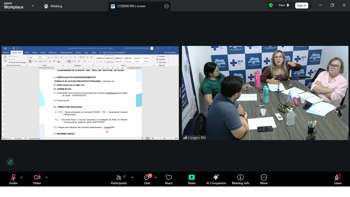 O Conselho de Secretarias Municipais de Saúde do Rio Grande do Norte (Cosems-RN) realizou, na tarde desta quarta-feira (11), uma reunião virtual da Câmara Técnica com a diretoria e equipe técnica do colegiado. O encontro teve como objetivo dialogar e alinhar, de forma prévia, os principais pontos que serão discutidos na reunião ordinária mensal do Conselho, marcada para a próxima quarta-feira (18).